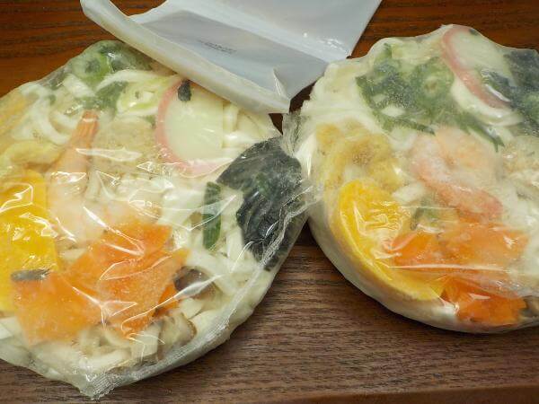 冷凍庫からとりだし、お湯のなかで10種の具とうどんを茹でるだけ。