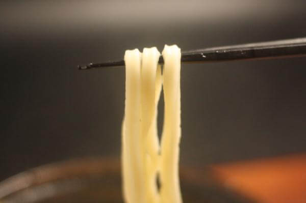 うどんの表面は、すこぶる滑らか。けれども、その重さゆえに、ちからをいれて白いうどんをすすりあげる必要があります。