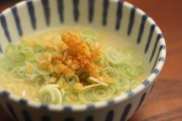 ねぎたっぷり、天かす、すこし辛味をくわるのもグッド。