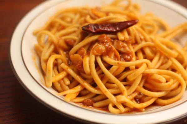 ミートソースのなかの肉は、肉食の魚のようなホロリとした質感です。
