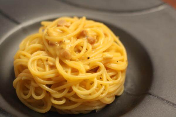 見ためは、カルボナーラです。ふしぎなことに、南国のフルーツのような甘い香りがあるように感じられるのです。
