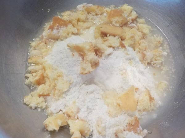 粒状にならないときは、すこしずつ生地に水をたし混ぜあわせる。