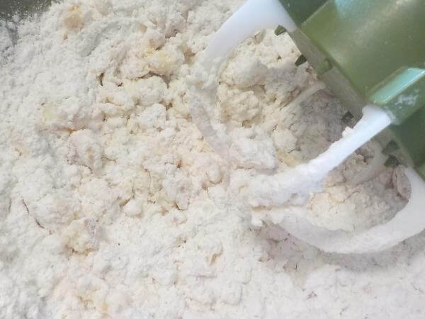 粉と水分を混ぜる専門の調理器具をつかい混ぜた。手で混ぜるように素早く混ぜることができる。