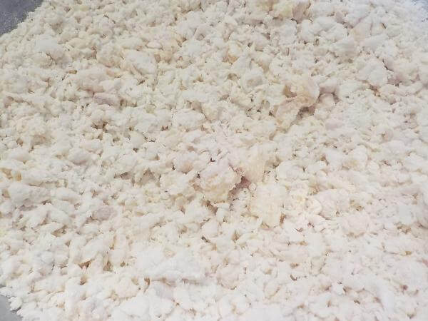中力粉全体に水分がいきわたり、しっとりと3mm~5mmほどの粒状になれば手をつかい粉をまとめていく。