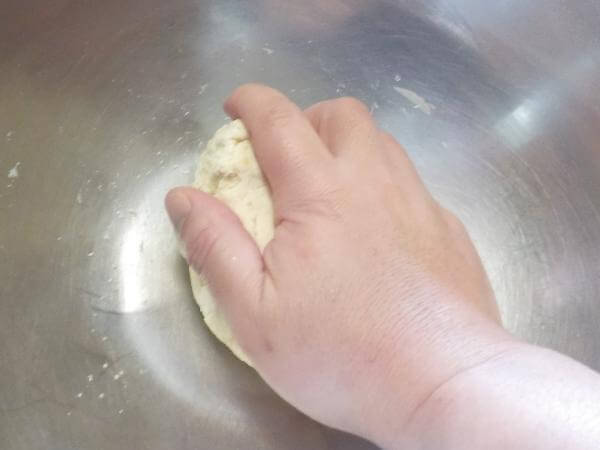 粒状になった粉をボウルにおしつけたり、のばしたりして、ひとつの塊にまとめ、形をととのえる。