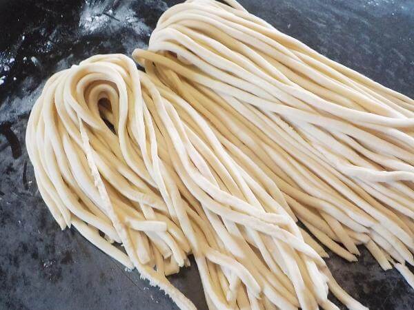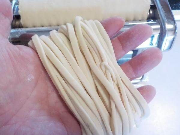 なめらかになった生地をお好みの薄さにのばす。食べやすい長さに切る。くっつかないように打ち粉をふっておく。