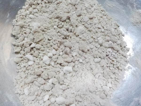 粉ぜんたいがしっとりし、粉が3~5ミリほどの粒になるまで混ぜあわせる。3~5ミリほどの粒にならないときは、水を追加でいれる。