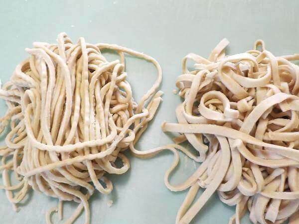 滑らかになった生地をお好みの薄さにまでのばす。打ち粉をふり、食べやすい長さに切っておく。
