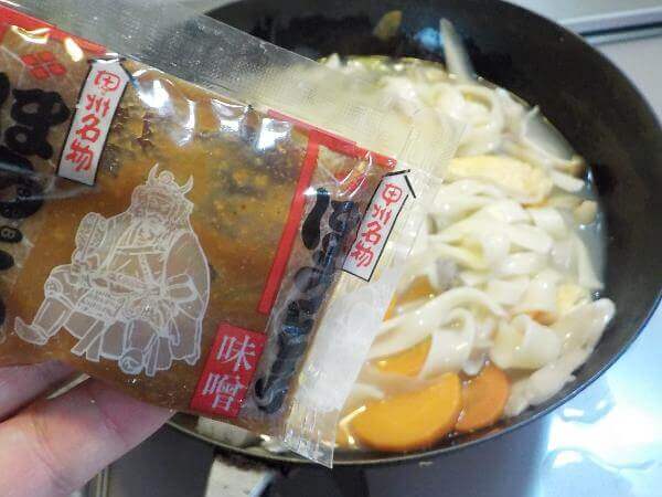 最後に味噌で味をととのえましょう。しっかりと味の濃い味噌です。味を確認しながら、味噌をくわえましょう。
