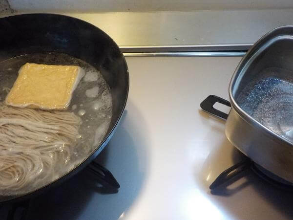 作り方はそばとおあげをゆでるお湯と、つゆを作るためのお湯を別々に用意します。