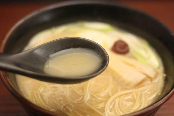 そのスープをひとくち飲むと、臭み、えぐみなどヒトカケラもない至純で澄んで明るい豚の脂が舌をぴったりとおおいつくします。
