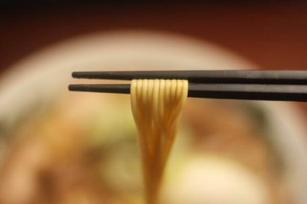 マルタイの麺は、空気でしっかりと乾燥させたノンフライ麵。麺の長さは、20㎝ほどでつかみやすい。しっかりとした歯ごたえのある安定の麺です。