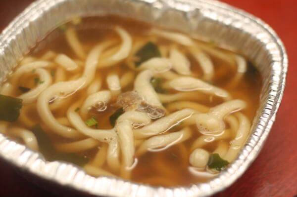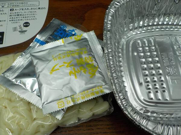 作り方は、お湯をわかし、銀色の器にそそぎいれ、そこにうどんとかやく、つゆをいれて煮れば作ることができます。