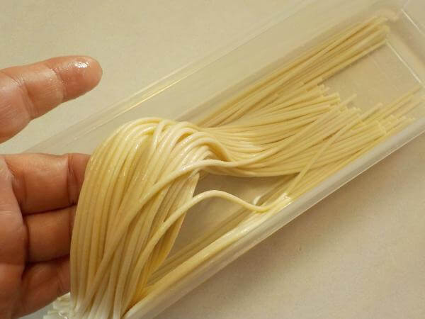 長さは、一般的な乾パスタとおなじ。フォークのすきまにはいりこみやすい太さです。