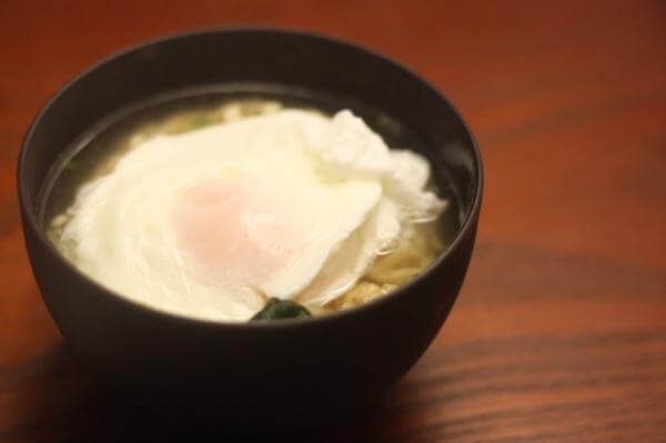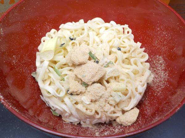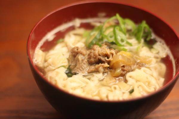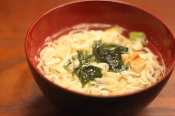 おうちにあるお椀にうどんと粉末スープをいれ、あつあつのお湯をそそぎいれれば作れるお手軽なうどんです。
