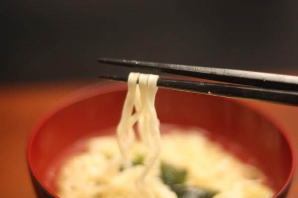 うどんのすすりぐあいは、赤い口のうえで、白いうどんがうねっているのを感じられるほどに角がしっかりとたっています。