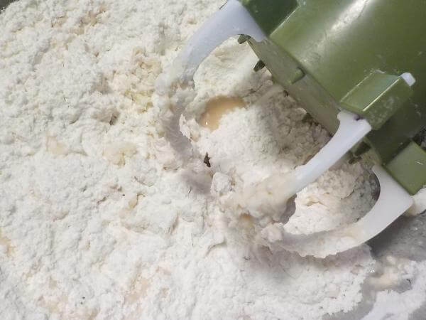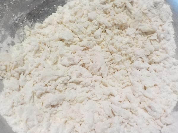 粉と水をボウルのなかで円を描くように混ぜあわせていく。ボウル内の粉が、3mm~5mmほどの粒になるまで混ぜる。粉ぜんたいが3mm~5mmほどの粒にならないときは、水を少しずつ追加し混ぜあわせる。