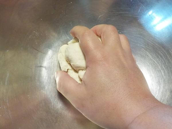 最初から手で粉と水を混ぜはじめると粘土状になった生地が手にくっついてしまう。そこで菜箸やゴムベラで粉と水を混ぜると、粉が指にくっつかないのでイライラしない。