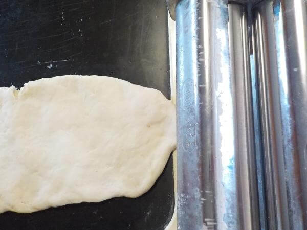 生地が滑らかになれば、お好みの薄さまで生地をのばす。食べやすい長さに生地を切る。くっつかないように打ち粉をふっておく。