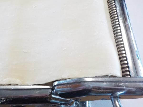 生地ぜんたいに打ち粉をふり、パスタマシーンに生地をのせる。
