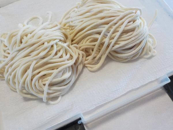 生麺は切ってすぐに食べるよりも寝かせてから食べたほうが滑らかになり、コシもよくなる。キッチンペーパーをしいた密閉容器に麺をいれ冷暗所で半日ほど寝かせる。