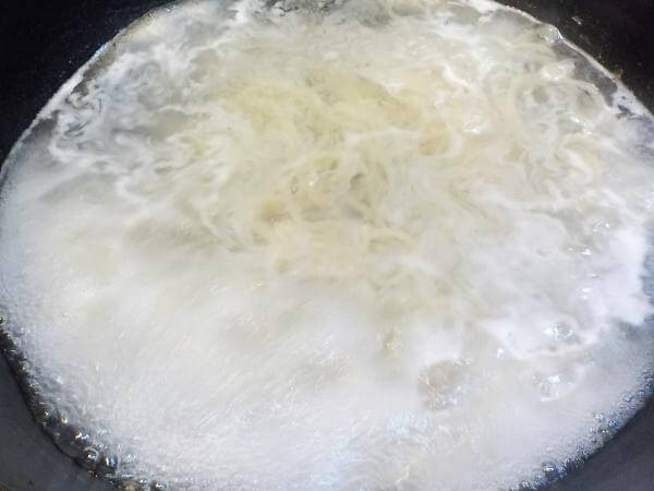 麺:100gにたいして、1~2リットルのお湯を用意する。沸騰したお湯に麺をいれゆでる。