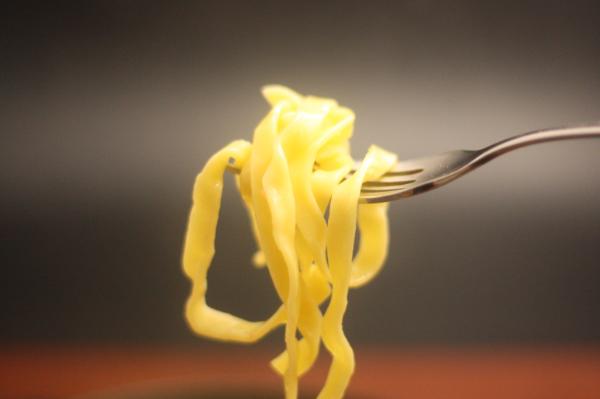 フェットチーネの表面はしっかりと粉をねりあげた結果、グルテンがしっかりと形成されており、溶けにくく、傷ひとつなく、がっちりとマッチョな印象。