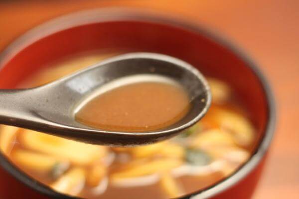 赤と黒を混ぜたようなレンゲのそこも見えないほどに濃い色のおつゆ。