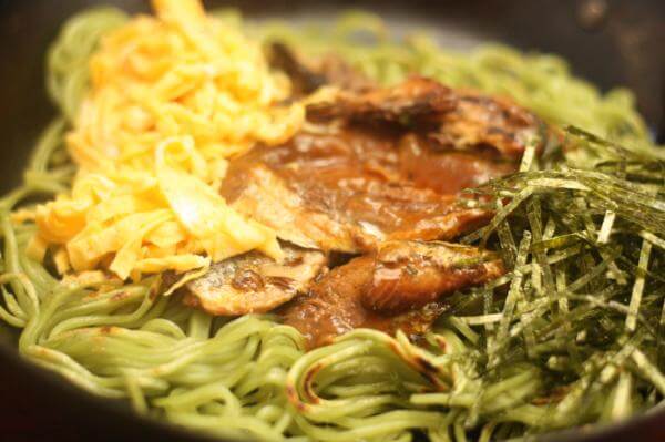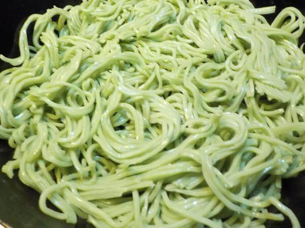 鮮烈な緑色のそばは、焼き時間、火力などで食感はかわってきます。
