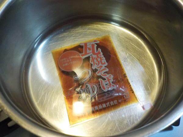 おつゆは湯せんで温めるように書かれています。お湯などでおつゆを割る必要はありません。
