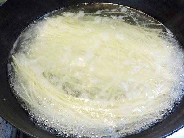 調理方法は、ふつうの乾麺のようにお湯でゆで、冷水でぬめりをとります。