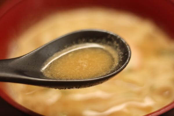 たっぷりのごまがはいっていることが想像できる、まるで味噌らーめんのような濃い色のおつゆ。