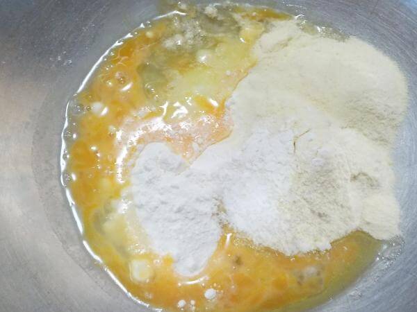 最初から手で混ぜると、ドロドロの粉が手にくっつき作業をしにくい。さいばしやゴムベラで混ぜあわせるとよい。