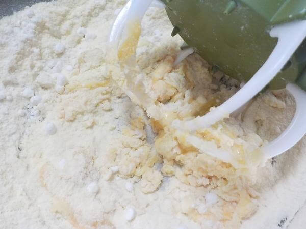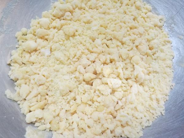 粉ぜんたいに水分がいきわたり、パン粉状になり、5mmほどの粒状になれば、手で作業してもくっつかない。5mmほどの粒状にならないときは、水をボウルに追加でいれる。