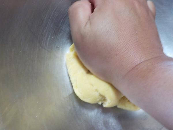 手をつかい粉をひとつの生地にまとめていく。ボウルに押しつけたり、丸めたり、折り曲げたりしていると、生地はまとまってくる。
