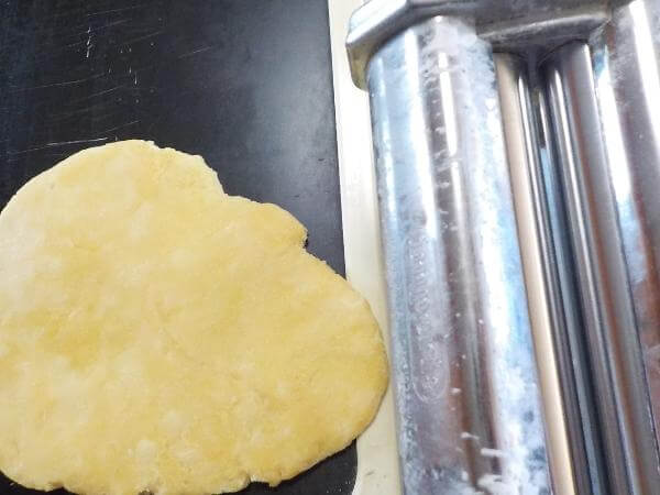 パスタマシーンのローラを通しますので、厚みは均等になります。
