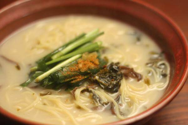高菜をいれることを考え味をととのえた、計算たかい和風の豚骨スープといえます。