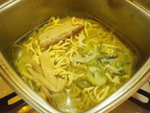 作り方はお湯をわかし、冷凍庫からとりだした麺と具をゆで、あとで味噌スープをくわえればできあがりです。