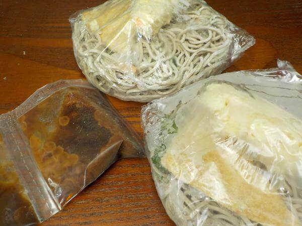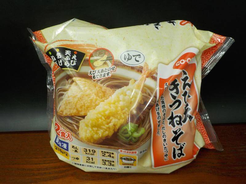 えび天ぷらとお揚げがのせられた冷凍そばは、生協で注文しました。
