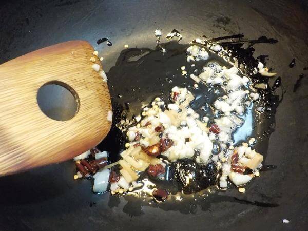 ニンニクとショウガ、唐辛子をごま油をひいたフライパンにいれ弱火で炒めます。