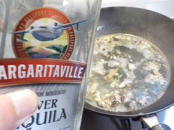 スープが沸騰してきたら味わいの肝であるテキーラをくわえます。たっぷりの量をくわえると濃くなり、量がすくないと味わいは薄くなります。