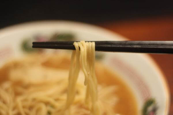 麺の表面は、しっかりしつつもスープがからみつきやすい二分の余白をのこしており、口あたりは、羽毛がたったように柔らかめ。
