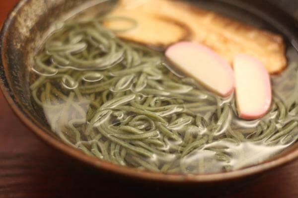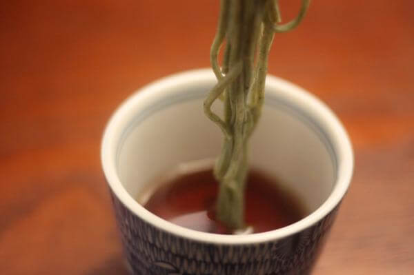 よもぎそばをめんつゆにどっぷりと漬けると、めんつゆ味になります。よもぎの香りを堪能したいかたは、めんつゆをひかえめにつけましょう。